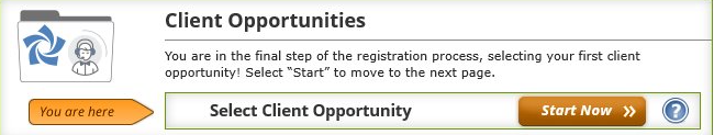 You are now in the final step of the registration process, in this regard under the ‘Client Opportunities’ tab, kindly select ‘Start’ to move to the next page where you will see a list of client opportunities to choose from and to Enrol in a certification course.